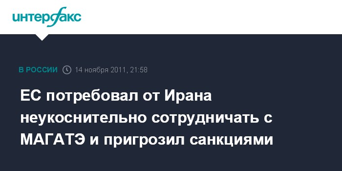 Брюссель. 14 ноября. INTERFAX.RU - Европейский союз потребовал от Ирана неукоснительно сотрудничать с МАГАТЭ и проявить готовность к серьезным и конкретным переговорам о мерах доверия в ответ на озабоченность международного сообщества характером его ядерной программы.