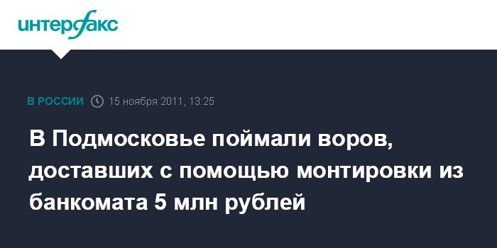 Москва. 15 ноября. INTERFAX.RU - Полицейские задержали "по горячим следам" двух человек из банды налетчиков, похитивших крупную сумму денег из банкомата в Московской области, сообщает пресс-служба ГУ МВД по региону.