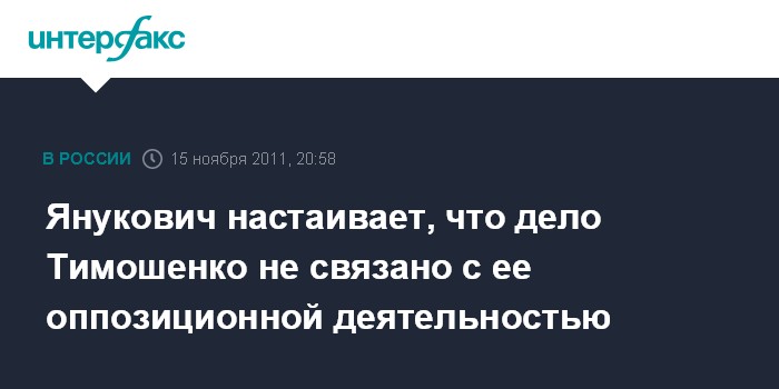 Вроцлав. 15 ноября. INTERFAX.RU - Президент Украины Виктор Янукович вновь заявил, что уголовное дело экс-премьера Юлии Тимошенко не имеет политической подоплеки.