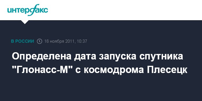 Москва. 16 ноября. INTERFAX.RU - Представители промышленности и Космических войск уточнили дату запуска с космодрома Плесецк (Архангельская область) космического аппарата "Глонасс-М", сообщил "Интерфаксу-АВН" в среду официальный представитель Управления пресс-службы и информации Минобороны РФ по Космическим войскам полковник Алексей Золотухин. По его словам, старт состоится 28 ноября.