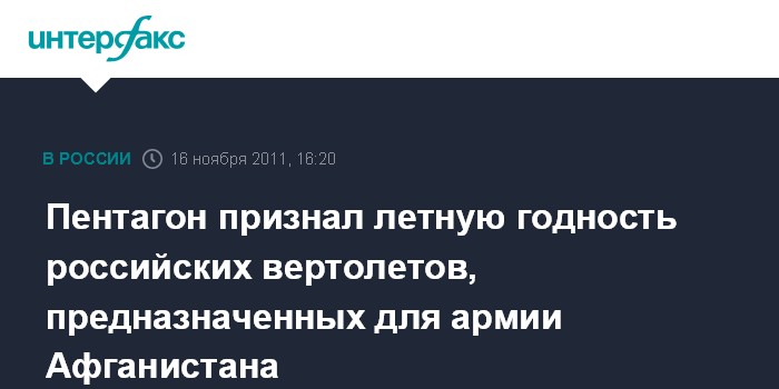 Москва. 16 ноября. INTERFAX.RU - Министерство обороны США вручило Федеральной службе по военно-техническому сотрудничеству России сертификат о признании процедур оценки летной годности военно-транспортных вертолетов Ми-17В-5, которые в рамках контракта будут поставлены афганской национальной армии.