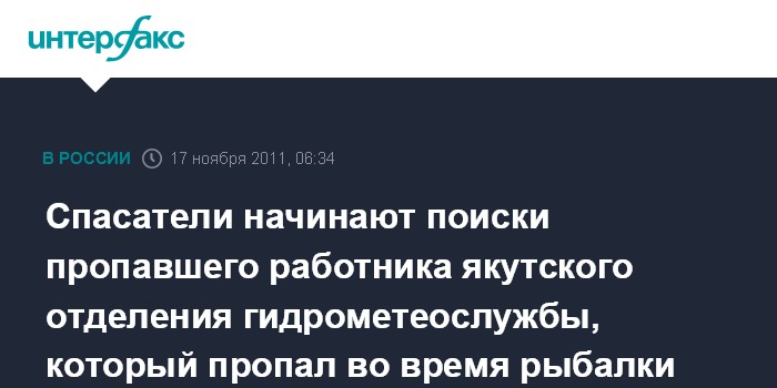 Якутск. 17 ноября. ИНТЕРФАКС-ДАЛЬНИЙ ВОСТОК - МЧС начинает поиски работника гидрометеослужбы Кобяйского района, который в конце октября уехал на рыбалку и не вернулся, сообщает в четверг пресс-служба ДВРЦ МЧС России.