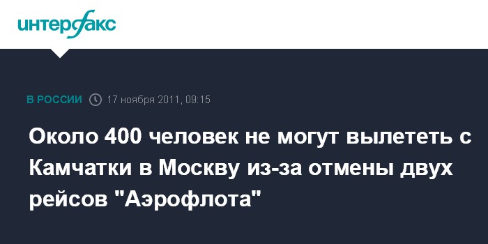 Петропавловск-Камчатский. 17 ноября. INTERFAX.RU - Сразу два авиарейса "Аэрофлота" по маршруту Петропавловск-Камчатский - Москва отменены 16 и 17 ноября.