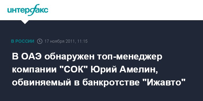 В ОАЭ обнаружен топ-менеджер компании "СОК" Юрий Амелин, обвиняемый в банкротстве "Ижавто"