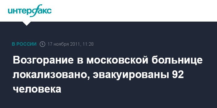 Возгорание в московской больнице локализовано, эвакуированы 92 человека