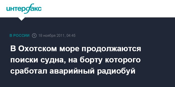 Южно-Сахалинск. 18 ноября. ИНТЕРФАКС-ДАЛЬНИЙ ВОСТОК - В южной части Охотского моря сахалинские суда ведут поиск судна, на борту которого сработал аварийный радиобуй, сообщили агентству "Интерфакс - Дальний Восток" в морском спасательном подцентре "Южно-Сахалинск".