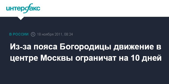 "В связи с проведением в Храме Христа Спасителя мероприятий, связанных с пребыванием пояса Пресвятой Богородицы, с 20 часов 18 ноября до окончания мероприятий 27 ноября 2011 года будет ограничено движение автотранспорта (кроме общественного) по Соймоновскому проезду и Пречистенской набережной (на участке от Крымского моста до улицы Ленивка)", - сказали в пресс-службе.