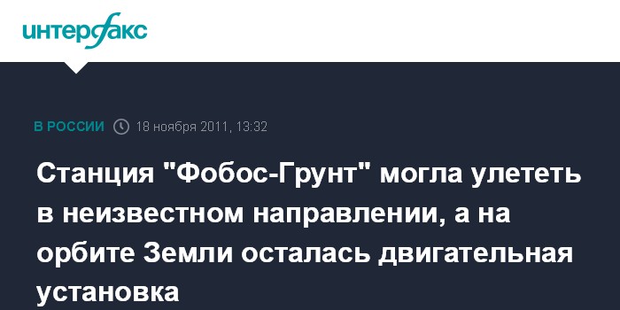 Москва. 18 ноября. INTERFAX.RU - Автоматическая межпланетная станция "Фобос-Грунт" могла превратиться в "космического странника" и улететь вглубь Солнечной системы, заявил в пятницу "Интерфаксу-АВН" источник в ракетно-космической отрасли.