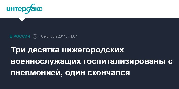 Нижний Новгород. 18 ноября. INTERFAX.RU - Около 30 военнослужащих Мулинского гарнизона в Нижегородской области госпитализированы с пневмонией, один из заболевших скончался, сообщила агентству "Интерфакс-Поволжье" председатель нижегородского областного комитета солдатских матерей Наталья Жукова в пятницу.