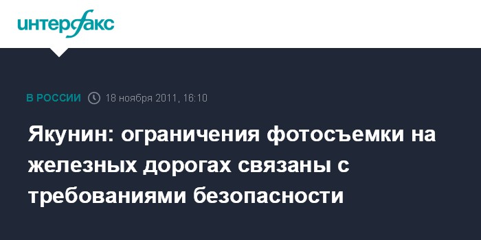 Москва. 18 ноября. INTERFAX.RU - Президент ОАО "РЖД" Владимир Якунин объяснил требованиями безопасности ограничения на фото- и видеосъемку на объектах железнодорожного транспорта.