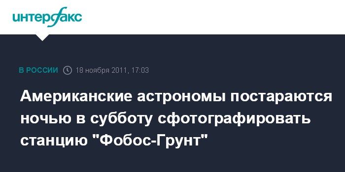 Москва. 18 ноября. INTERFAX.RU - Специалисты из США постараются получить визуальное изображение застрявшей на околоземной орбите межпланетной станции "Фобос-Грунт" с помощью пятиметрового телескопа.