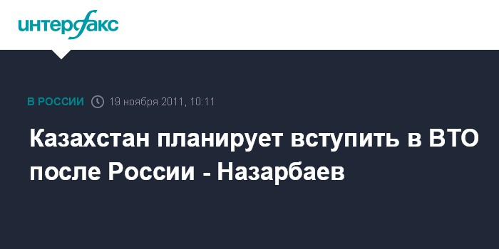 Москва. 19 ноября. INTERFAX.RU - Президент Казахстана Нурсултан Назарбаев полагает, что республика вступит в ВТО к концу будущего года. "Мы тоже фактически закончили переговоры со всеми странами (членами ВТО - ИФ), остается год. И я думаю, что в конце 2012 года Казахстан тоже будет в ВТО", - сказал Н.Назарбаев в Москве в интервью агентствам "Интерфакс" и РИА Новости.
