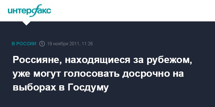 Москва. 19 ноября. INTERFAX.RU - Досрочное голосование на выборах в Госдуму начинается в эту субботу за рубежом. Всего в список вошло 54 страны, в некоторых из которых, например, в США, Турции, Болгарии, Латвии и т.д. будет организовано по нескольку участков для досрочного голосования.