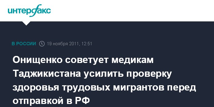 14 ноября Г.Онищенко предложил ввести временный запрет на привлечение трудовых ресурсов из Таджикистана. По его словам, таджикских трудовых мигрантов часто выдворяют из РФ после того, как у них обнаруживают опасные заболевания, в том числе, ВИЧ и туберкулез.