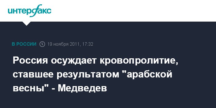 Уфа. 19 ноября. INTERFAX.RU - Кровопролитие и гражданскую междуусобицу, которые стали результатами так называемой "арабской весны", Россия осуждает и не приемлет, заявил президент РФ Дмитрий Медведев.