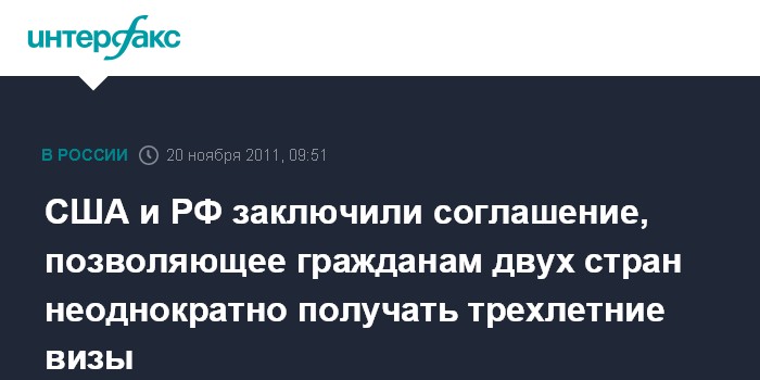 Вашингтон. 20 ноября. INTERFAX.RU - США и Россия договорились о выдаче виз, предусматривающих установление трехлетнего многократного режима въезда для граждан двух стран, говорится в сообщении госдепартамента.
