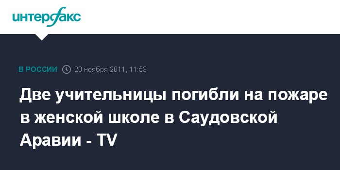 Дубай. 20 ноября. INTERFAX.RU - По меньшей мере две учительницы погибли в результате пожара в женской школе в городе Джидда, расположенном на западе Саудовской Аравии у побережья Красного моря, сообщает в воскресенье межарабский телеканал "Аль-Арабийя". Спасателям удалось ликвидировать огонь, в данный момент все еще продолжается эвакуация 700 учениц, 110 преподавательниц и 32 сотрудниц школы.