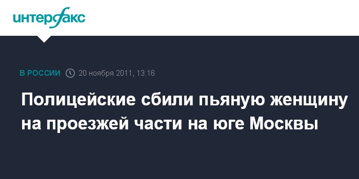 Москва. 20 ноября. INTERFAX.RU - Женщина, попавшая под колеса полицейского автомобиля минувшей ночью в Москве, находилась в нетрезвом состоянии и переходила дорогу в неположенном месте, сообщили "Интерфаксу" в пресс-службе ГУ МВД России по Москве.