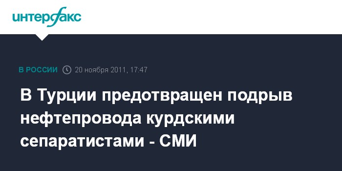 Стамбул. 20 ноября. INTERFAX.RU - Сотрудники сил безопасности Турции предотвратили взрыв нефтепровода, который хотели организовать, предположительно, курдские сепаратисты, сообщает в воскресенье турецкая газета "Хабер экспресс". Три взрывчатки мощностью 200 килограмм в тротиловом эквиваленте были заложены вдоль трубопровода на юго-востоке страны, через который иракская нефть поступает в Турцию.