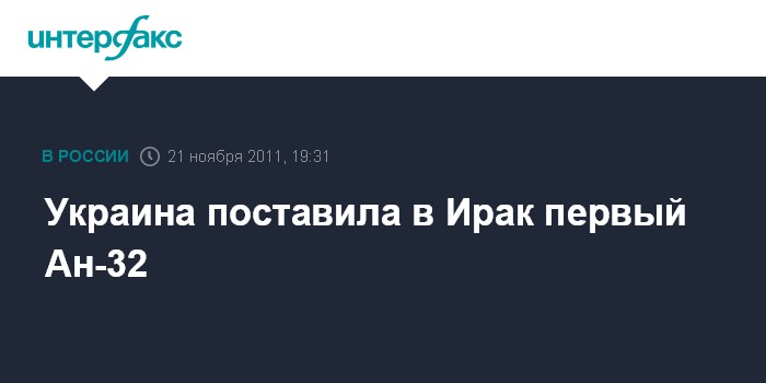 Киев. 21 ноября. INTERFAX.RU - Украина обеспечила поставку в Ирак первого из шести легких транспортных Ан-32, которые собираются в Киеве в рамках контракта объемом свыше $550 млн на поставку иракскому заказчику украинской военной техники.