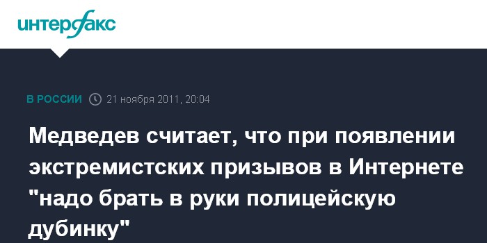 "Потому что, если из Интернета или социальных сетей льются призывы идти и резать кого-то - нельзя говорить о свободе Интернета. Надо брать в руки полицейскую дубинку и разбираться с такими людьми, потому что это подрывает основы общественного согласия", - сказал Д.Медведев.