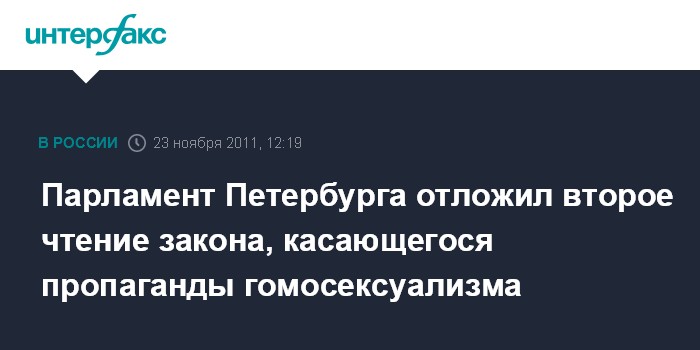 Санкт-Петербург. 23 ноября. INTERFAX.RU - Законодательное собрание Петербурга на заседании в среду приняло решение отложить рассмотрение во втором чтении законопроекта о запрете пропаганды гомосексуализма, передал корреспондент "Интерфакса".