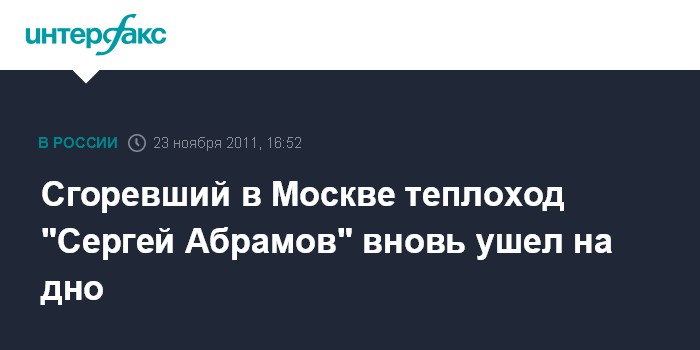Москва. 23 ноября. INTERFAX.RU - Теплоход "Сергей Абрамов", сгоревший в московском Северном речном порту 14 ноября, снова заполнился водой и лег на дно, сообщил "Интерфаксу" источник в правоохранительных органах.