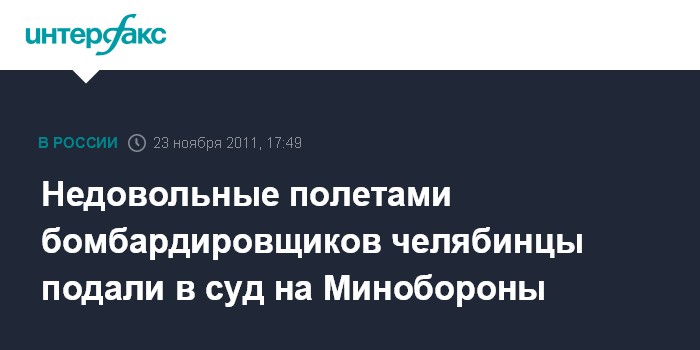 Челябинск. 23 ноября. INTERFAX.RU - Несколько жителей Челябинска и общественное движение "За природу" подали заявление в суд с требованием прекратить полеты фронтовых бомбардировщиков Су-24 над городом, сообщается на сайте уполномоченного по правам человека Челябинской области.
