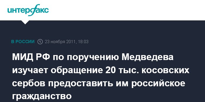 МИД РФ по поручению Медведева изучает обращение 20 тыс. косовских сербов предоставить им российское гражданство