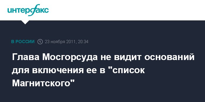 Москва. 23 ноября. INTERFAX.RU - Председатель Мосгорсуда Ольга Егорова не располагает информацией о включении ее в так называемый "список Магнитского".