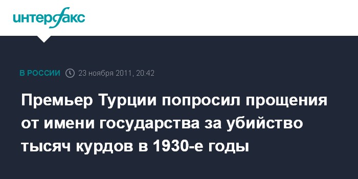 Стамбул. 23 ноября. INTERFAX.RU - Глава правительства Турции Реджеп Тайип Эрдоган принес извинения от имени государства курдам за убийство тысяч представителей этого народа в 1930-е годы в ходе военной кампании властей, сообщает в среду местное телевидение.