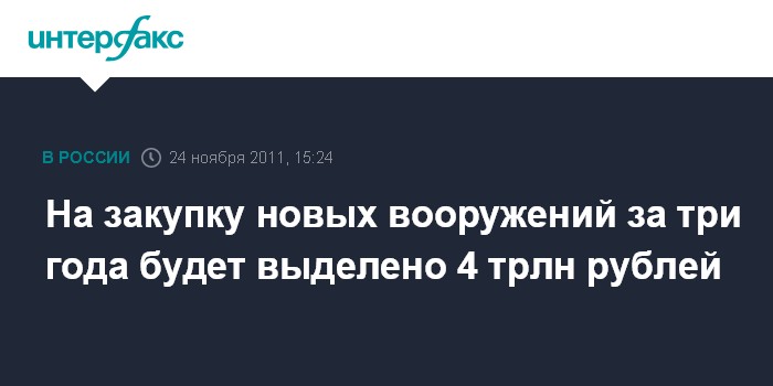 "В ближайшую трехлетку на оснащение военной организации государства и прежде всего на серийную закупку новой современной техники планируется потратить около 60% выделяемых на гособоронзаказ ресурсов, а это почти 4 трлн рублей", - сказал Иванов на заседании военно-промышленной комиссии при правительстве РФ, которая должна рассмотреть проект гособоронзаказа на 2012-2014 годы.