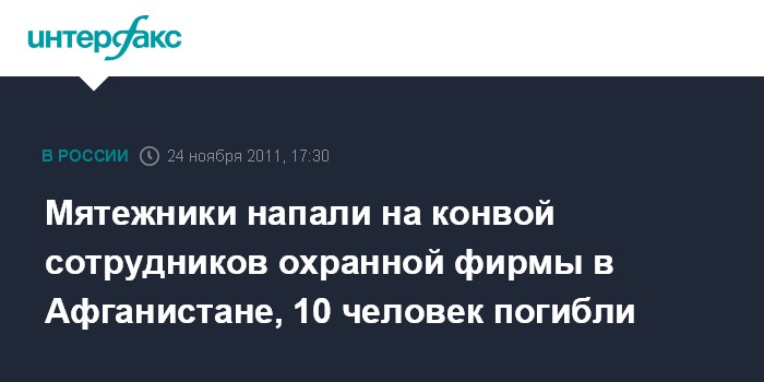 Лондон. 24 ноября. INTERFAX.RU - По меньшей мере, десять сотрудников частной охранной фирмы погибли и 10 получили ранения в результате нападения мятежников в провинции Фарах, на западе Афганистана, сообщает в четверг BBC со ссылкой на представителя губернатора провинции.