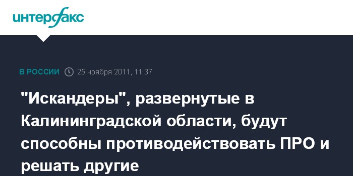 "Само оружие (комплекс "Искандер" - ИФ-АВН) уникально и способно решать задачи не только в рамках пресечения возможности по развертыванию ПРО, но и ряд других задач", - сказал Остапенко, комментируя заявление президента РФ о возможности развертывания "Искандеров" в Калининградской области.