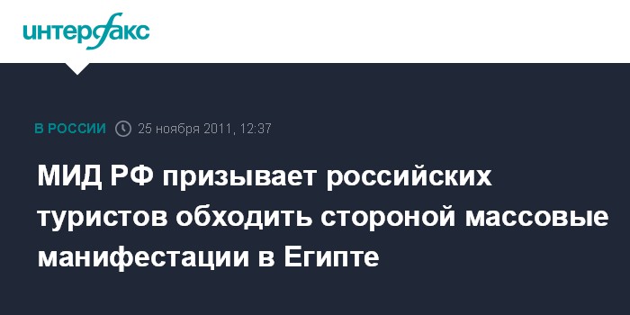 Москва. 25 ноября. INTERFAX.RU - МИД России рекомендует российским туристам не появляться в Египте в зонах, где проходят манифестации, и рассчитывает на нормализацию обстановки в этой стране в свете предстоящих парламентских и президентских выборов.