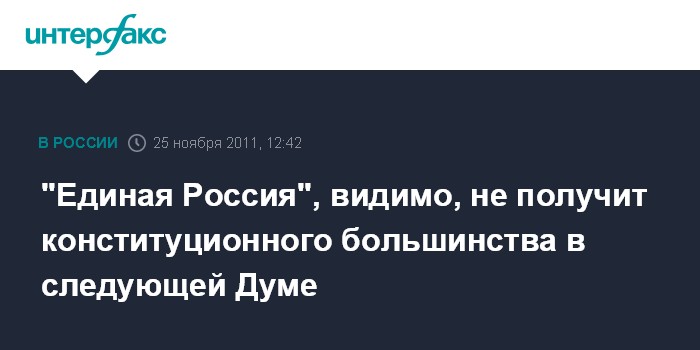 Москва. 25 ноября. INTERFAX.RU - Согласно ряду социологических опросов, партия "Единая Россия" в Государственной думе шестого созыва потеряет конституционное большинство.