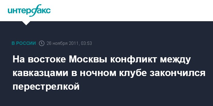 Москва. 26 ноября. ИНТЕРФАКС-МОСКВА - В Москве в Восточном административном округе, в помещении клуба "Бэд Бинг" на улице Константина Федина, д. 11 произошла перестрелка.