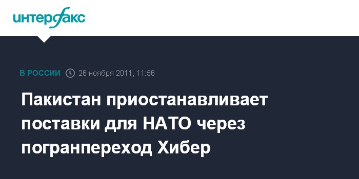 Исламабад. 26 ноября. INTERFAX.RU - Власти Пакистана объявили в субботу о решении приостановить поставки для войск НАТО в Афганистане через погранпереход Хибер, сообщают местные СМИ.