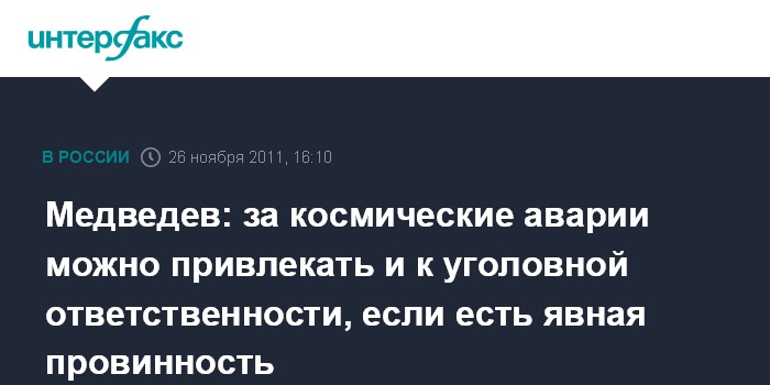 Горки. 26 ноября. INTERFAX.RU - Президент РФ Дмитрий Медведев считает, что ответственных за аварии российских космических аппаратов можно привлекать даже к уголовной ответственности.