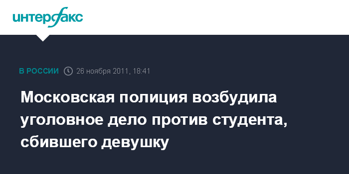 Москва. 28 ноября. INTERFAX.RU - Сотрудники московской полиции возбудили уголовное дело против 20-летнего студента, сбившего на иномарке молодую женщину и скрывшегося после этого с места происшествия, сообщает в субботу ГУ МВД по Москве.