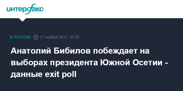 Цхинвали. 27 ноября. ИНТЕРФАКС - Данные экзит-поллов свидетельствуют, что во втором туре президентских выборов в Южной Осетии побеждает глава МЧС Анатолий Бибилов, который набирает 53% голосов избирателей, сообщили в воскресенье "Интерфаксу" в ЦИК республики.