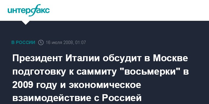 Президент Италии обсудит в Москве подготовку к саммиту "восьмерки" в 2009 году и экономическое взаимодействие с Россией