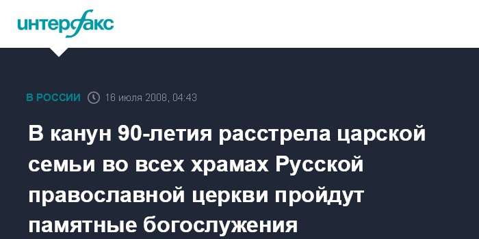 Москва. 16 июля. ИНТЕРФАКС - Во всех храмах Русской православной церкви пройдут богослужения в честь святых царственных страстотерпцев, 90-я годовщина со дня расстрела которых приходится на этот четверг.