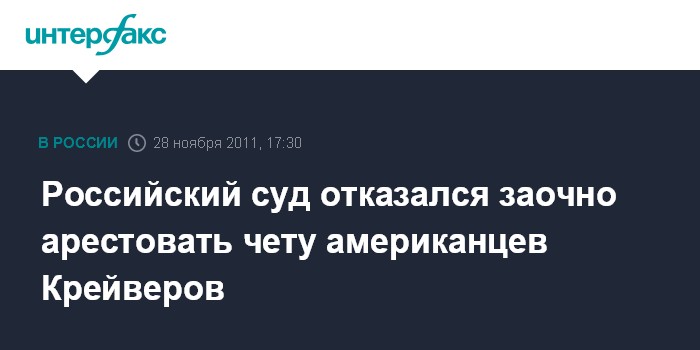 Москва. 28 ноября. INTERFAX.RU - Басманный суд Москвы отказался выдать санкцию на заочный арест гражданина США Майкла Крейвера, обвиняемого в РФ в убийстве усыновленного российского мальчика Ивана Скоробогатова.