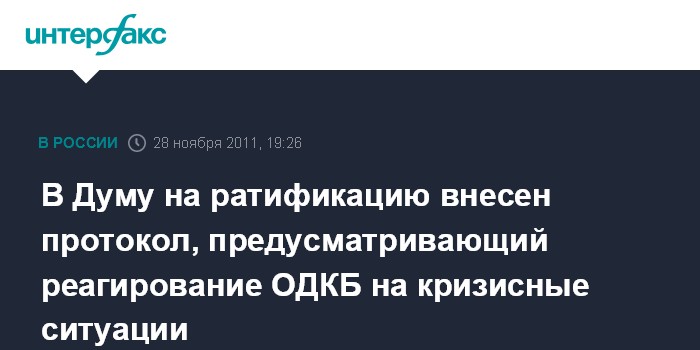 Москва. 28 ноября. INTERFAX.RU - Президент России Дмитрий Медведев внес на ратификацию в Госдуму протокол изменений в устав ОДКБ, который был подготовлен в связи с кризисной ситуацией, возникшей в Киргизии в 2010 году, что обусловило необходимость совершенствования механизма использования силового потенциала ОДКБ для реагирования на такие ситуации.