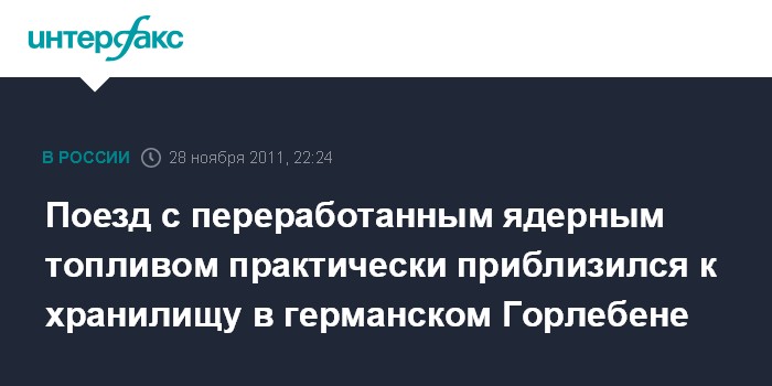 Берлин. 28 ноября. INTERFAX.RU - Поезд с переработанным во Франции германским ядерным топливом практически достиг конечного пункта.