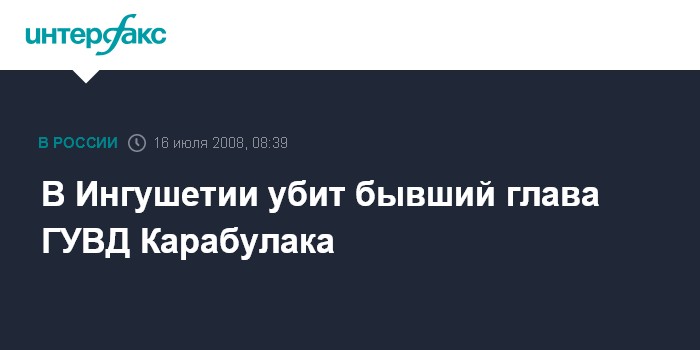 Москва. 16 июля. INTERFAX.RU - В городе Карабулаке в Ингушетии неизвестные во вторник вечером расстреляли бывшего начальника ГУВД города Ахмета Мурзабекова, сообщил агентству "Интерфакс- Юг" источник в МВД Ингушетии. По его информации, инцидент произошел у железнодорожного переезда, между Карабулаком и муниципальным округом Плиево города Назрань. "Неизвестные лица из автоматического оружия расстреляли А.Мурзабекова и скрылись с места происшествия. От полученных ранений последний скончался при доставлении в больницу", - сказал источник.