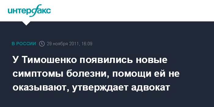 Киев. 29 ноября. INTERFAX.RU - Состояние здоровья Тимошенко резко ухудшилось, ей уже сутки не оказывают медицинскую помощь, заявляет ее защитник Сергей Власенко.