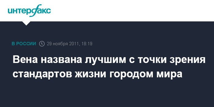 Лондон. 29 ноября. INTERFAX.RU - Столица Австрии Вена является самым привлекательным с точки зрения стандартов жизни городом мира, свидетельствуют данные Mercer, выдержки из которых приводит агентство Bloomberg.