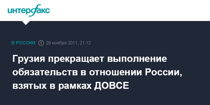 "Грузия с 29 ноября прекращает выполнение следующих обязательств в отношении России: отныне грузинская сторона не будет предоставлять РФ информацию в рамках ежегодного информационного обмена, который осуществлялся в соответствии с соглашением ДОВСЕ , Грузия больше не будет предоставлять каких-либо сообщений России в рамках соглашения ДОВСЕ, и Грузия больше не будет принимать инспекций, затребованных Россией в рамках соглашения ДОВСЕ", - подчеркивается в заявлении МИД.